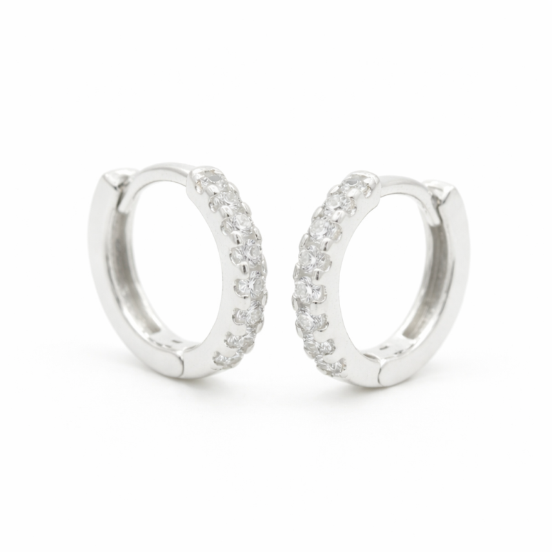 Brinco em Prata 925 tipo argola pequena com zircônias brancas, ideal para segundo furo, clássico e elegante, perfeito para realçar o brilho do seu dia a dia.