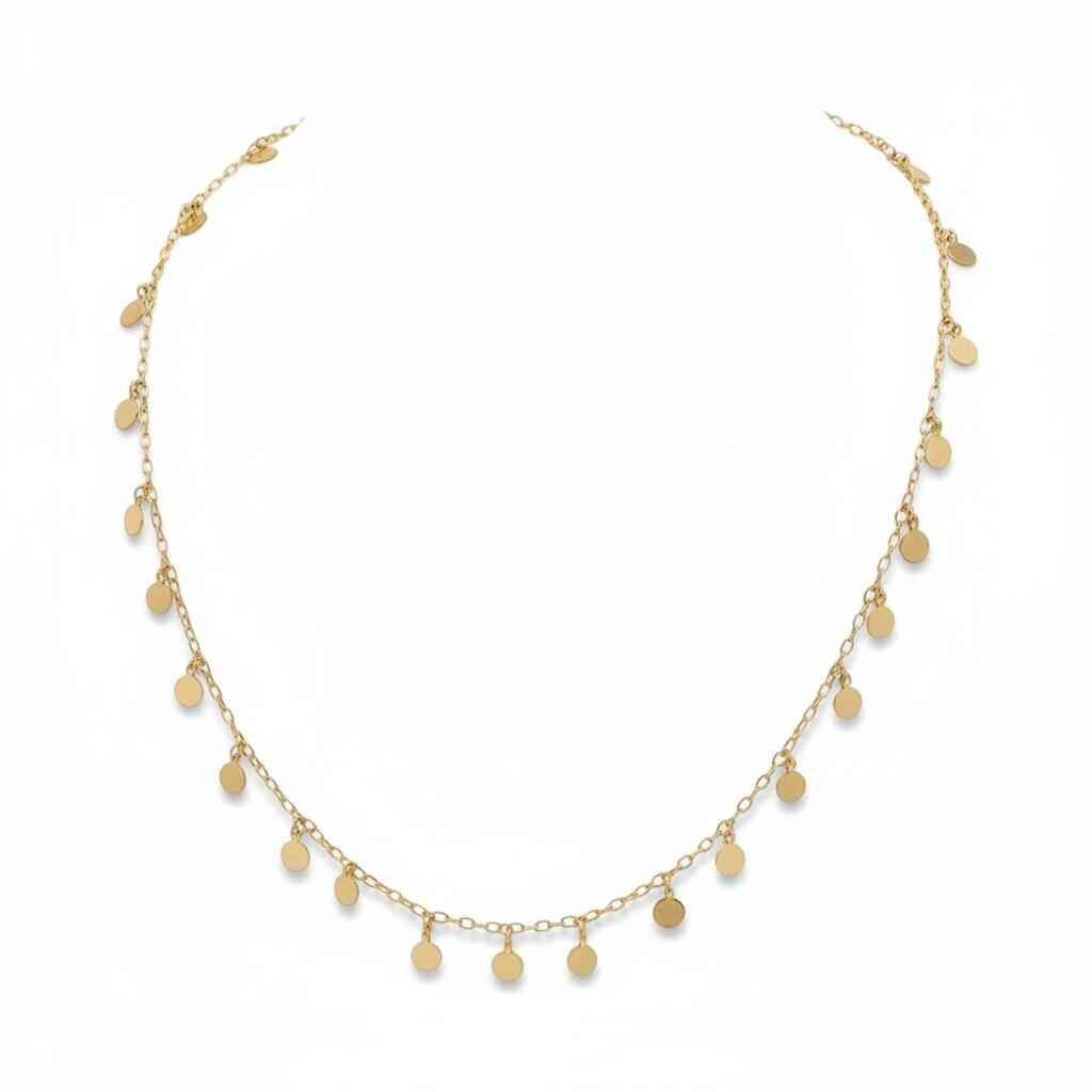 Delicada e sofisticada, esta gargantilha em ouro 18k apresenta 30 pingentes de chapa redonda que criam um brilho sutil e contínuo. Uma joia leve, moderna e perfeita para valorizar qualquer produção — do casual ao elegante. Ideal para quem ama peças marcantes com toque minimalista.