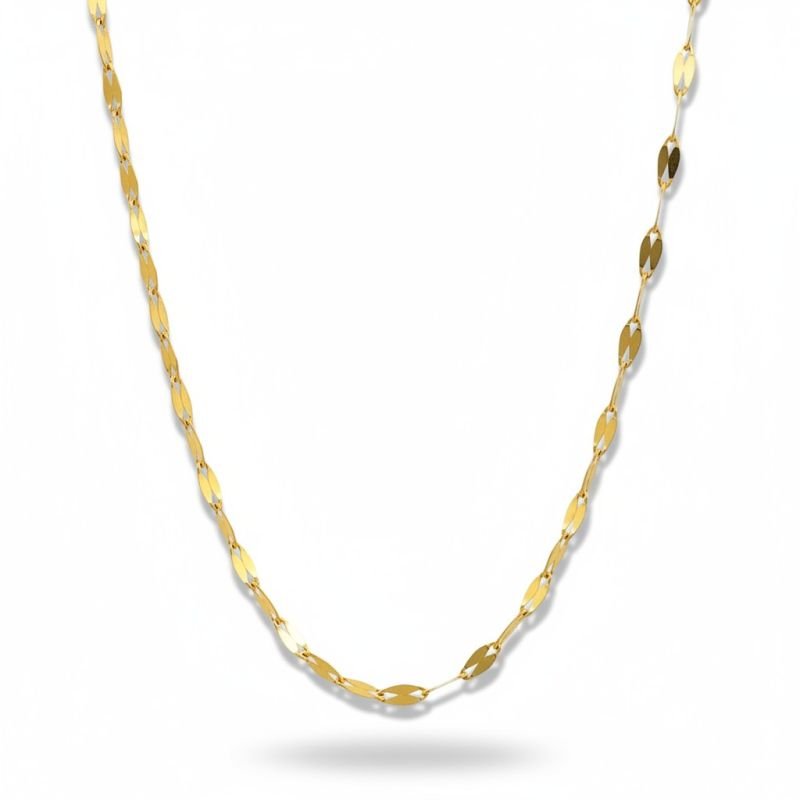 A corrente em malha coffee é marcada por elos levemente achatados e entrelaçados, que conferem brilho único e um visual elegante.