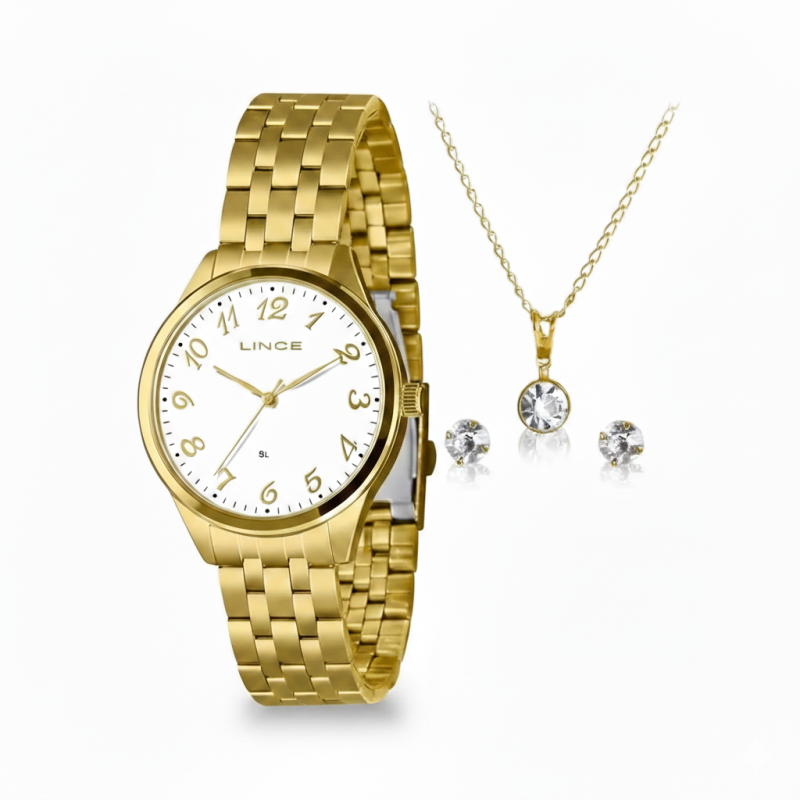 Kit Relógio Feminino Lince Urban – Caixa Dourada com Pulseira em Aço