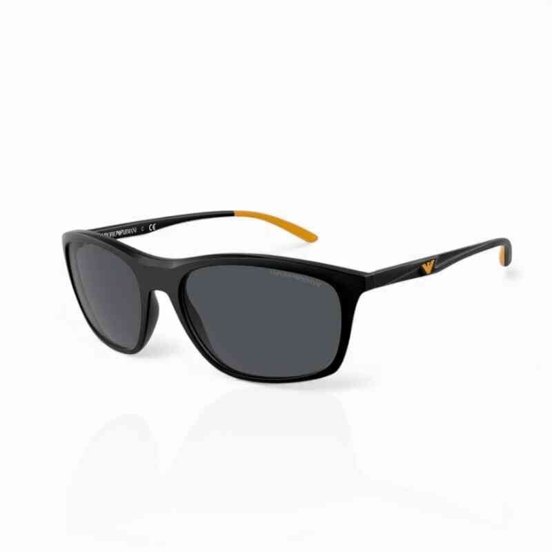 É um modelo específico de óculos de sol masculino da Emporio Armani, caracterizado por sua armação preta fosca e lentes cinza escuras.