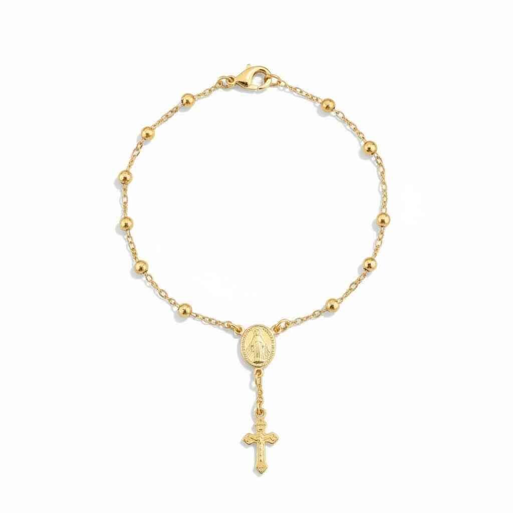 Pulseira Terço em Ouro 18K com esferas delicadas distribuídas pela corrente e medalha central de Nossa Senhora, finalizada por um pingente de cruz. Uma peça leve, elegante e repleta de significado, perfeita para quem deseja carregar fé, proteção e sofisticação no dia a dia.