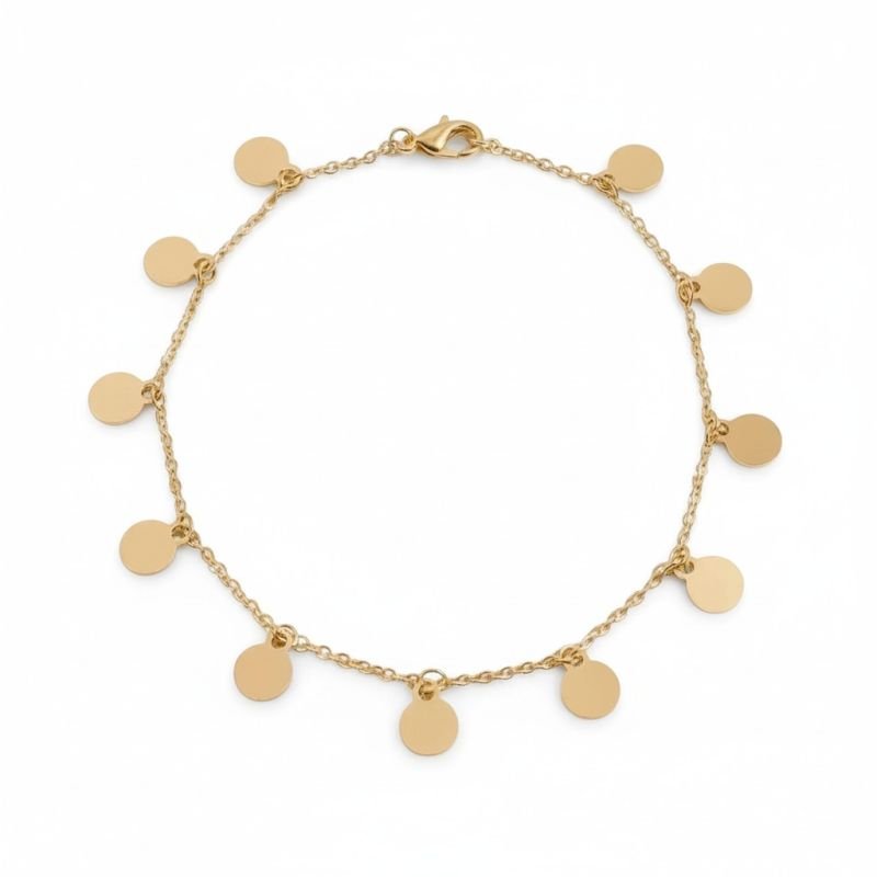 Pulseira em Ouro 18K com delicada corrente e pingentes de chapa redonda distribuídos ao longo da peça. Leve, moderna e cheia de movimento, ela traz aquele brilho sutil que valoriza qualquer look. Uma joia versátil, perfeita para o dia a dia e para combinar com outras pulseiras, criando um mix elegante e contemporâneo. Ideal para quem busca estilo com simplicidade e sofisticação.
