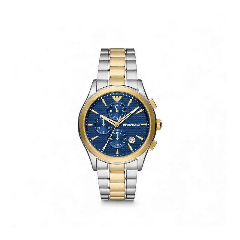 O Relógio Emporio Armani AR11579 combina design italiano marcante, visual sofisticado e funcionalidade esportiva. Com caixa de 42mm em aço inoxidável bicolor (prata e dourado) e mostrador azul texturizado, este cronógrafo transmite elegância e presença. A pulseira em aço inox bicolor de 22mm traz conforto e estilo, enquanto o movimento a quartzo com funções de cronógrafo e data garante performance confiável. Ideal para homens que buscam versatilidade, estilo e praticidade em um só acessório.