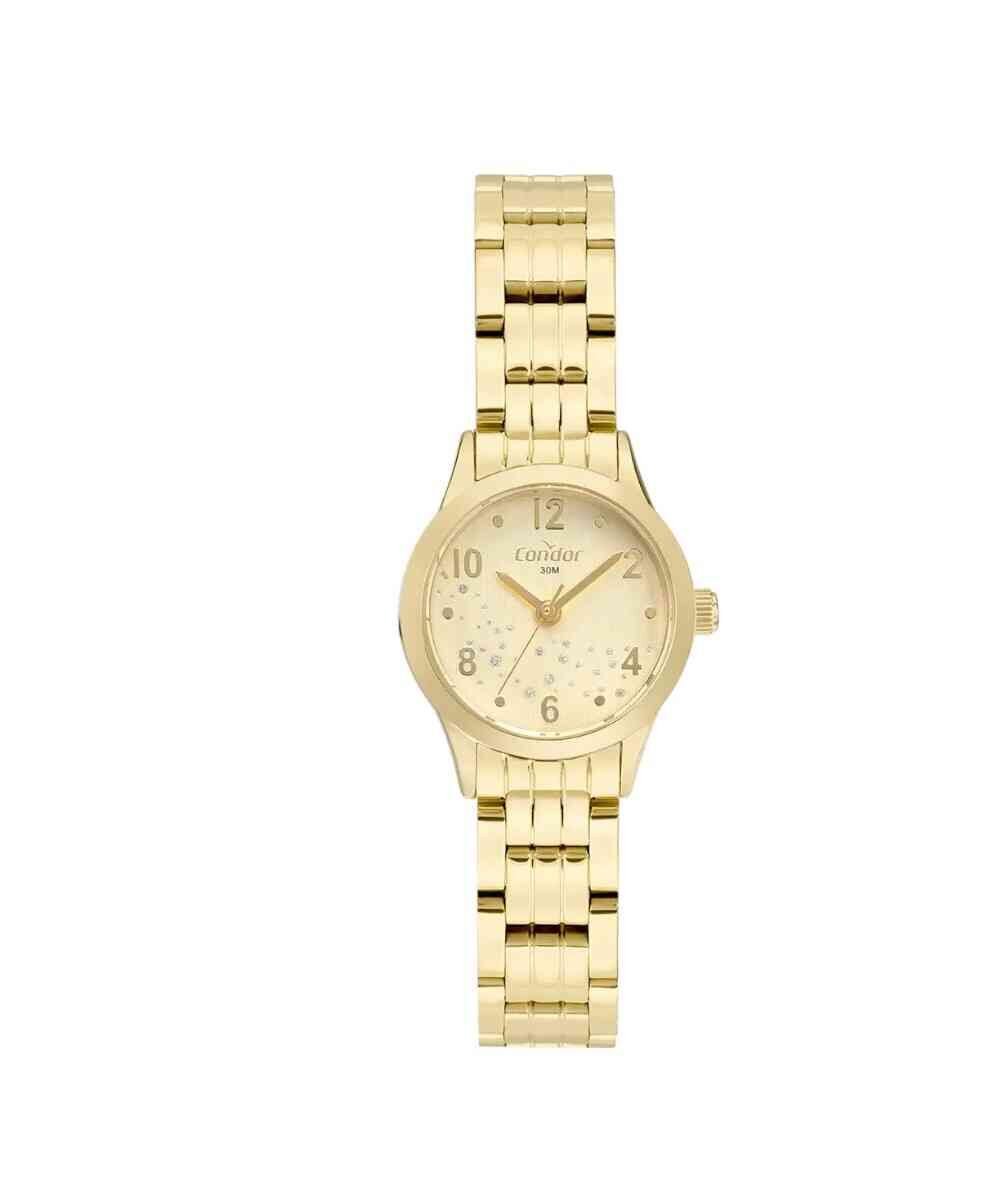 Relógio feminino, com sistema analógico indicando as horas, minutos e segundos. Caixa em aço, vidro em cristal mineral e botões para ajuste de horas. Mostrador personalizado com indicadores ponteados por strass e numéricos. Pulseira em aço trabalhado com fechamento por botão na lateral.