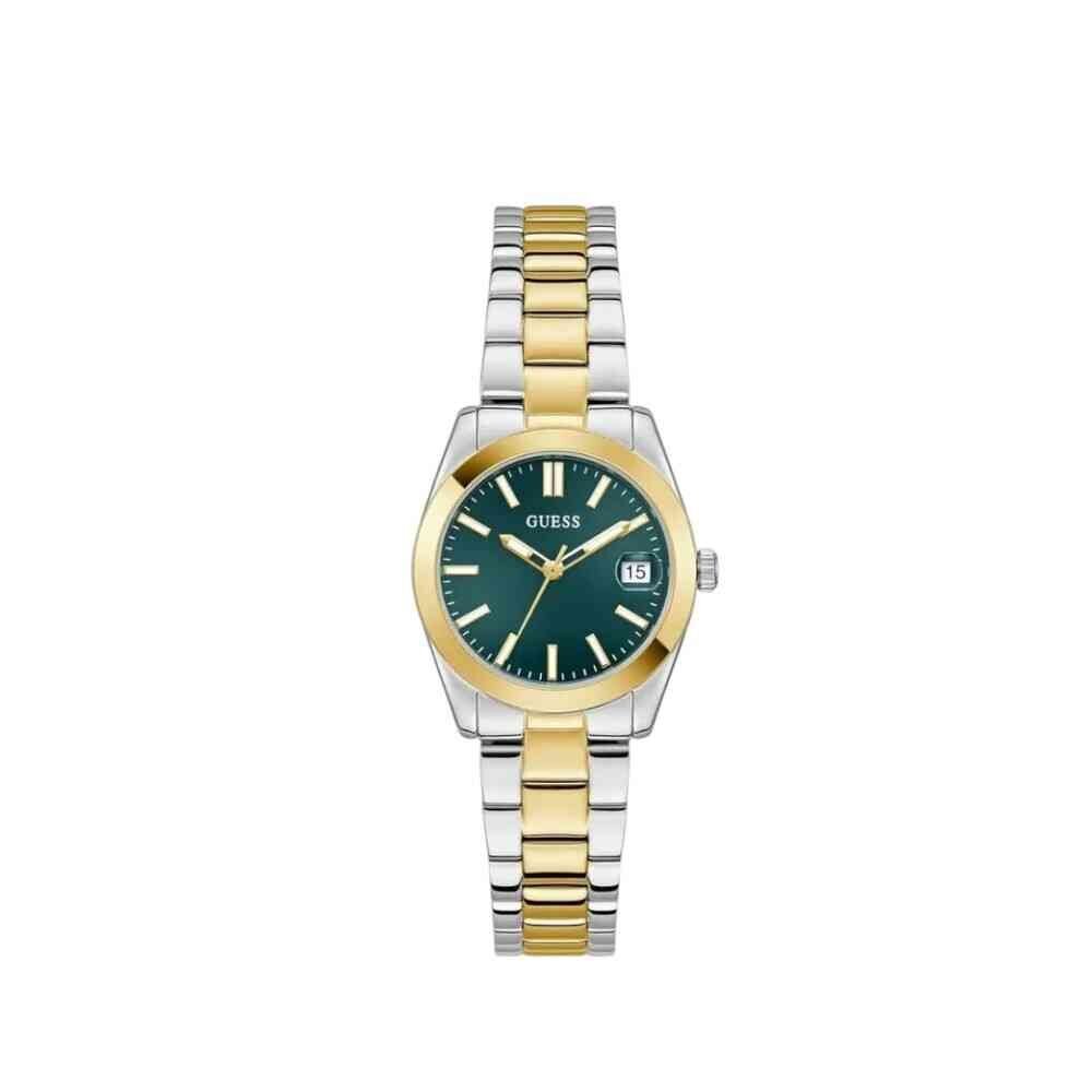 O Guess GW0934L3 une sofisticação e precisão em um design marcante. Equipado com movimento quartzo de alta confiabilidade, possui caixa em aço inoxidável de aproximadamente 32 mm e mostrador verde, que adiciona personalidade ao visual. A pulseira em aço inoxidável mista valoriza o acabamento refinado da peça. Conta com vidro em cristal mineral e resistência à água de 3 ATM, sendo ideal para o uso diário com estilo e elegância.