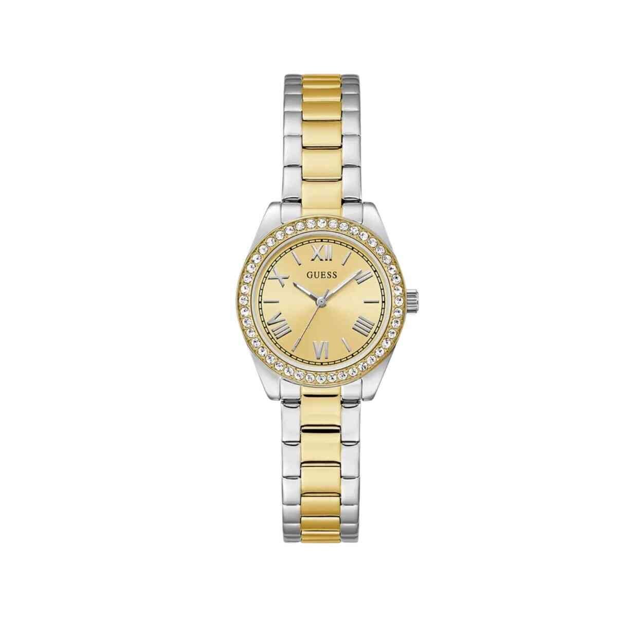 Delicado e elegante, o Guess Mini Luna GW0841L2 possui caixa de 30 mm em aço reciclado, com acabamento bicolor prata e dourado. Seu mostrador champanhe traz sofisticação ao design, enquanto a pulseira em aço reciclado garante conforto e durabilidade. Conta com vidro em cristal mineral, resistência à água de 30 m e garantia de 1 ano, sendo ideal para quem busca estilo e sustentabilidade no dia a dia.