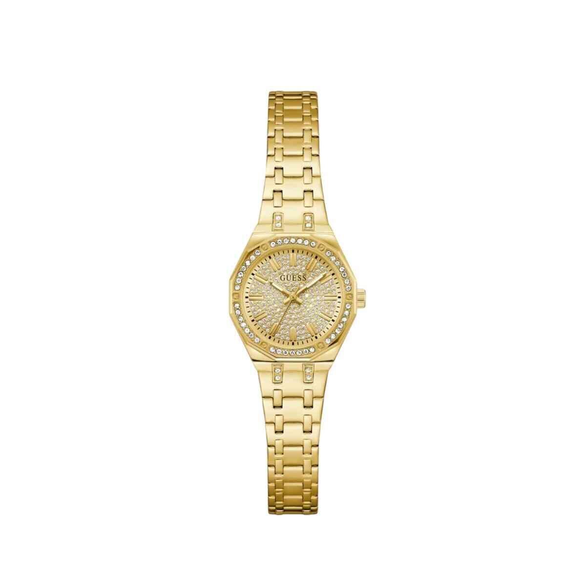 Delicado e sofisticado, o Guess Pixie GW0931L2 possui caixa de 25 mm em aço dourado com aplicação de cristais, que realçam o brilho do mostrador dourado. A pulseira em aço dourado garante elegância e conforto, enquanto o vidro em cristal mineral oferece proteção e durabilidade. Conta com resistência à água de 30 m e garantia de 1 ano, sendo a escolha perfeita para quem busca um acessório feminino, refinado e atemporal.