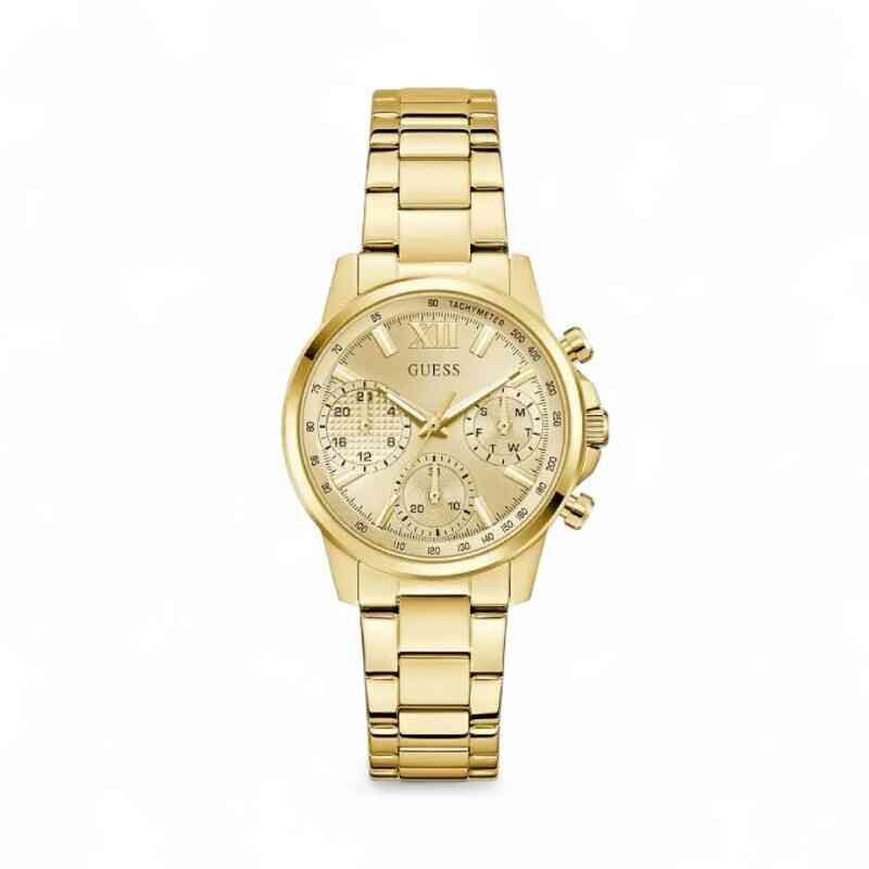 - Material: A caixa e a pulseira são feitas de aço inoxidável polido na cor dourada.