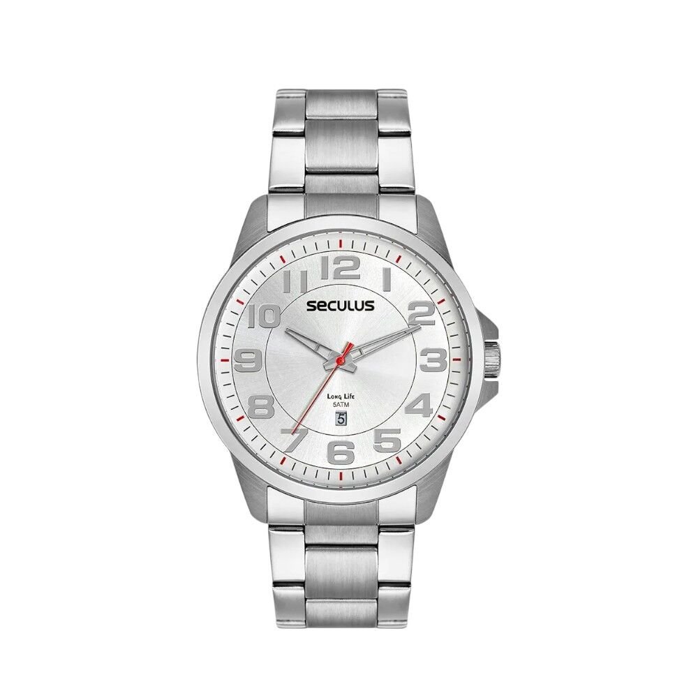 Relógio analógico com calendário é todo em aço, ideal para um estilo casual refinado. Seu marcante visor monocromático, com efeito metálico, e numeração completa proporcionam uma leitura fácil. Com uma caixa de 4,6 cm de diâmetro e folheação cromada, este relógio ostenta uma pulseira trabalhada em aço escovado e polido, completa com fecho de trava de segurança para tranquilidade adicional. Seu design versátil se adapta perfeitamente a todos os tamanhos de pulso, combinando funcionalidade e estilo em um único acessório.