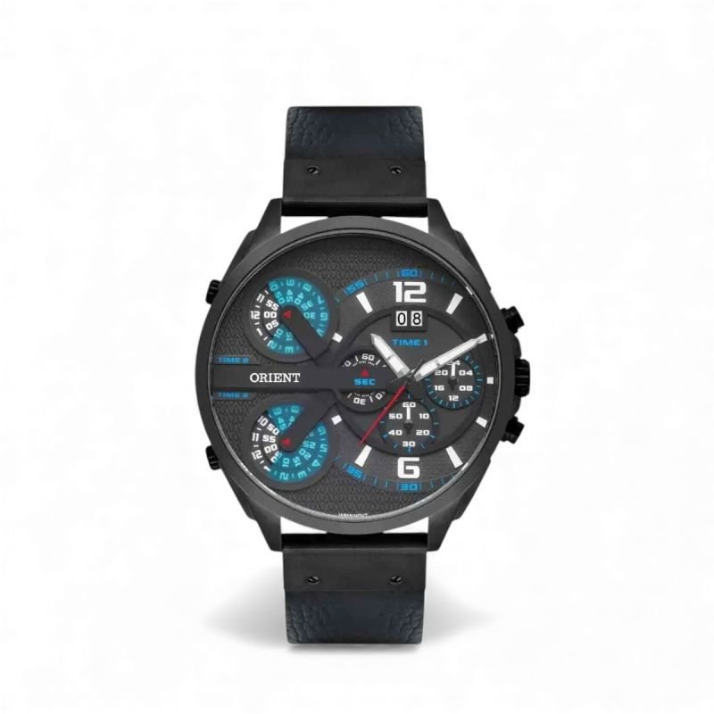 Relógio Masculino Orient XL Cronógrafo. É um relógio com 50mm de largura. Possui resistência à água de 5atm. Com essa classificação o relógio é resistente às ocasiões mais comuns como chuva lavar as mãos e tomar banho de chuveiro por exemplo. Sua caixa em aço e pulseira em couro, seu vidro é de cristal mineral e possui mostrador preto. Seu funcionamento é Analógico.