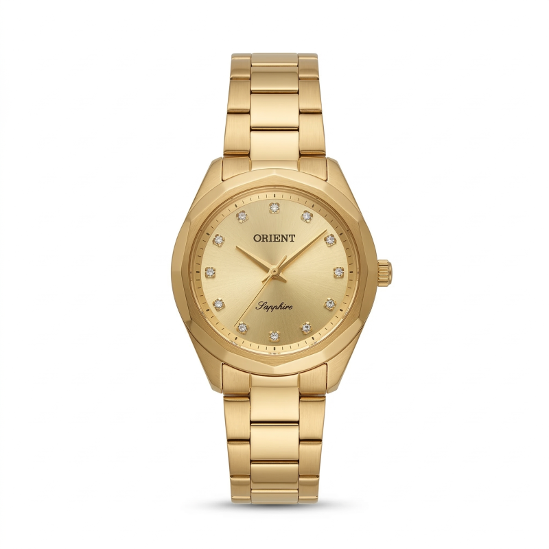Um relógio feminino ideal para quem busca sofisticação com discrição. O acabamento dourado em aço inoxidável, o mostrador com cristais austríacos e o vidro de safira criam um design que combina elegância e durabilidade. Com caixa de 34?mm, movimento a quartzo, resistência à água de 3 ATM, ele oferece estilo e confiança para o uso diário ou eventos especiais.