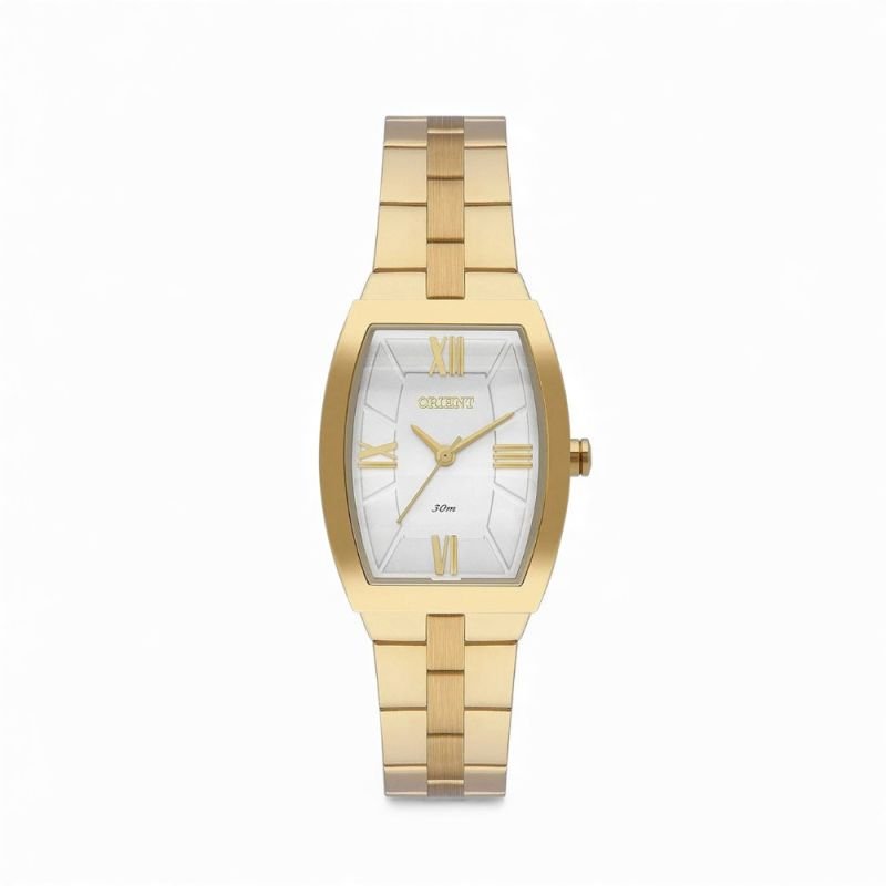 Possui mecanismo Analógico, a pulseira é na cor Dourado, fabricada em Aço, com 22 cm de comprimento e possui Fecho Dobrável com Dois Botões. A Caixa (peça onde fica o mostrador) é fabricada em Aço, possui fundo do tipo Pressão, mede 3,0 cm alt x 2,5 cm larg, sem considerar a coroa, e 0,8 cm de espessura, o que é considerado tamanho Médio para relógios do gênero feminino. Tem nível de resistência à água especificado em 3 ATM.