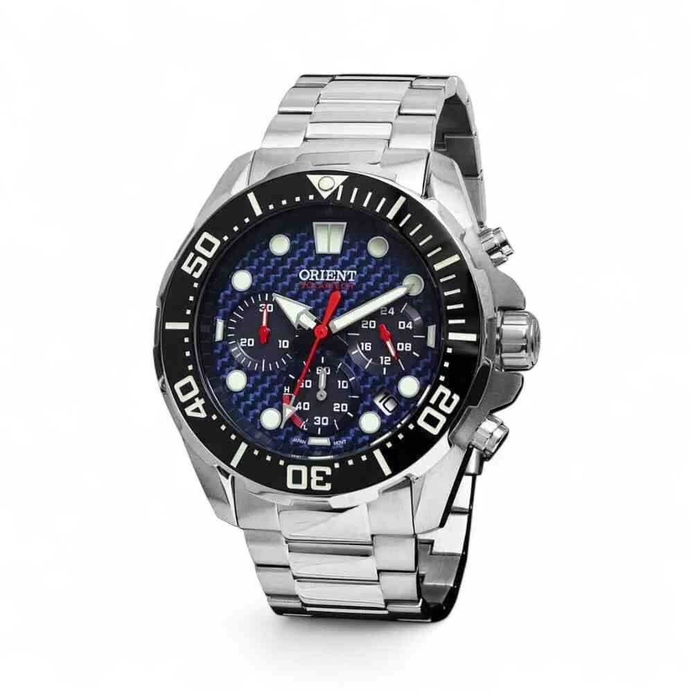 Alto desempenho e estilo robusto para quem exige o máximo. Com visual imponente e tecnologia de ponta, este cronógrafo masculino une resistência extrema e sofisticação. Movido a energia solar, oferece autonomia de até 4 meses, visor preto com detalhes em azul e índices em relevo, garantindo excelente legibilidade e presença marcante.