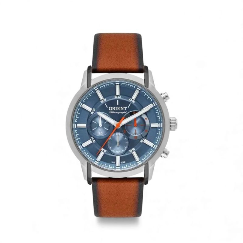 Cor do mostrador: Azul em camadas e indexes em relevo. Cor da caixa: Prata. Cor da pulseira: Marrom.