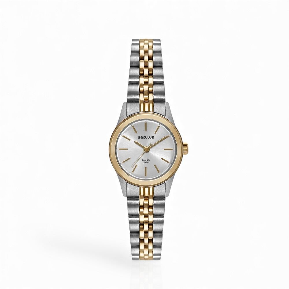 Relógio analógico todo em aço, com caixa pequena de 25 mm e visor minimalista, ideal para um visual elegante e discreto. Possui folheação prata e dourada, que acrescenta sofisticação, além de pulseira em pequenos gomos que garante conforto e bom ajuste. O fecho lateral facilita a adaptação a diferentes tamanhos de pulso, tornando o uso prático no dia a dia.