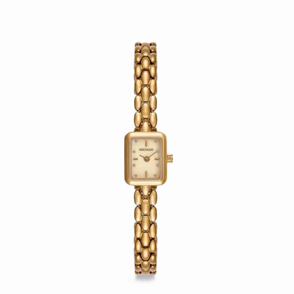Relógio feminino de design sofisticado, com caixa retangular e pulseira em aço com banho dourado. O mostrador em madrepérola, com cristais marcando as horas, confere brilho e elegância, enquanto o movimento aparente acrescenta um toque exclusivo e tecnológico. Uma peça imponente, ideal para quem valoriza luxo, estilo e delicadeza.