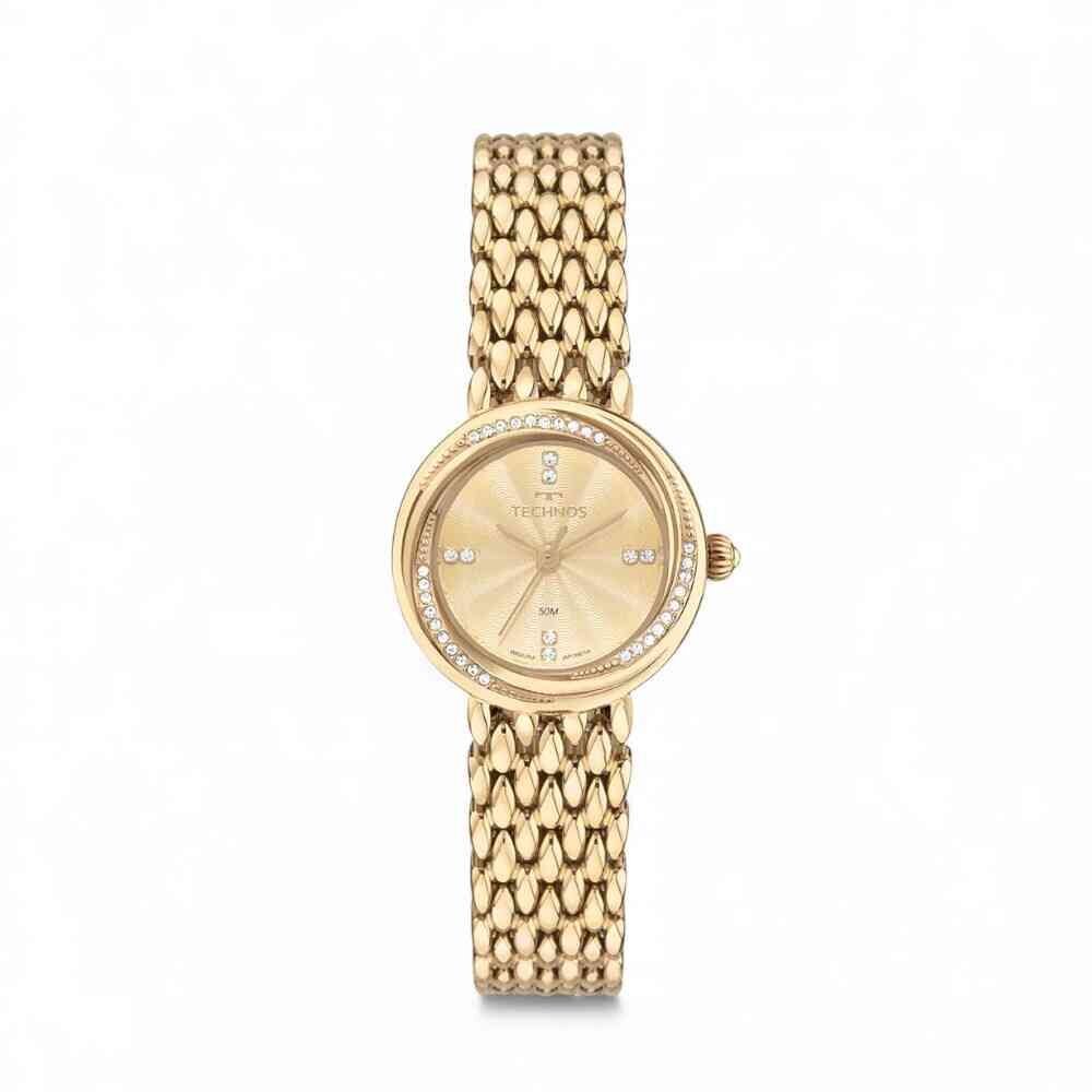 Relógio Mini apresenta um novo lançamento de design sofisticado inspirado em joia, definido pela aplicação de pedras no aro e no mostrador na cor dourado, além da pulseira sólida com fecho de joia e do mostrador texturizado. Produto 100% em aço inoxidável, banhado em dourado, máquina quartz Japonesa Miyota e resistência à água de 50 metros.