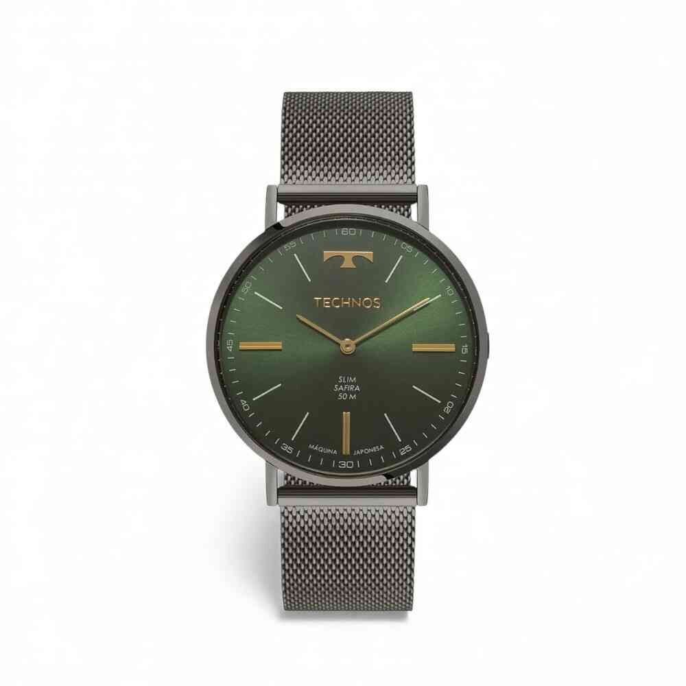 Conta com caixa em aço de 40 mm de diâmetro e 7 mm de espessura, com fundo por pressão, oferecendo perfil elegante e tamanho médio para o público masculino.
