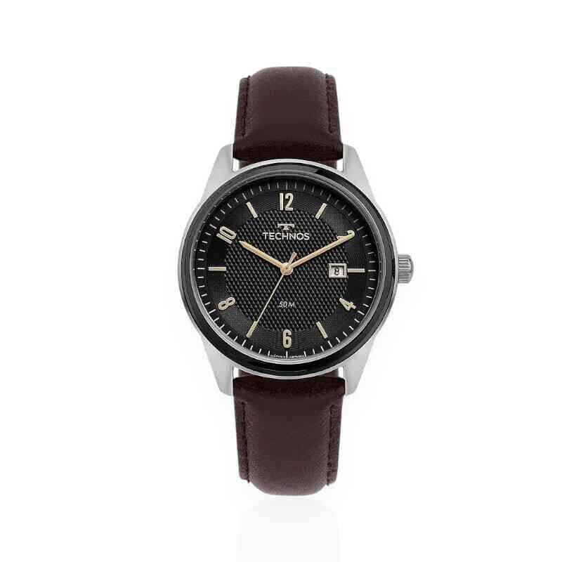 Equipado com mecanismo quartz, oferece função analógica com calendário, proporcionando praticidade na rotina. A pulseira em couro marrom completa o design clássico e confortável. Conta ainda com resistência à água de 5 ATM e garantia de 12 meses pela rede autorizada Technos.